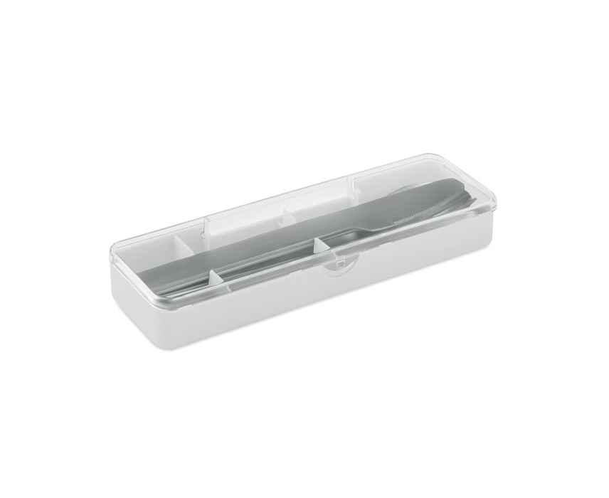 Набор столовых приборов из нержавеющей стали в полипропиленовом футляре. В набор входят вилка, нож и ложка.