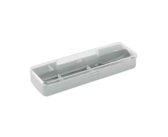 Набор столовых приборов из нержавеющей стали в полипропиленовом футляре. В набор входят вилка, нож и ложка.