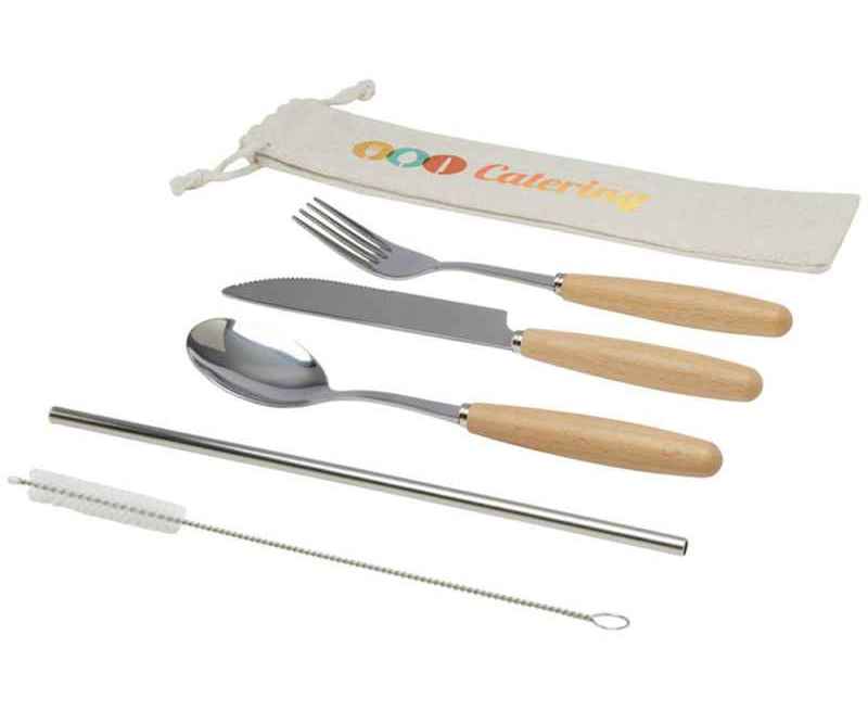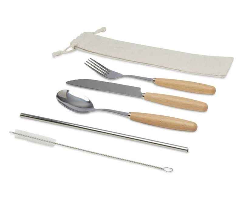 Набор столовых приборов Root — это стильное и практичное решение для тех, кто ценит удобство и экологичность. В комплект входят вилка, нож, ложка, многоразовая соломинка и щеточка для её чистки. Рабочая часть выполнена из прочной нержавеющей стали, а деревянные ручки из бука придают приборам естественный шарм и комфорт в использовании. Всё это аккуратно упаковано в компактный хлопковый мешочек — удобно брать с собой на пикник, в поездку или на работу.