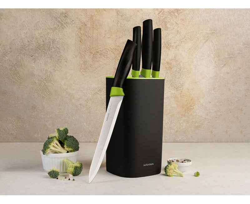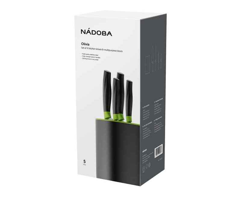 Набор ножей 5 предметов NADOBA серии Olivia состоит из: нож овощной, 9 см, нож универсальный, 12,5 см, нож разделочный, 20 см, нож поварской, 20 см и универсального блока для хранения ножей.