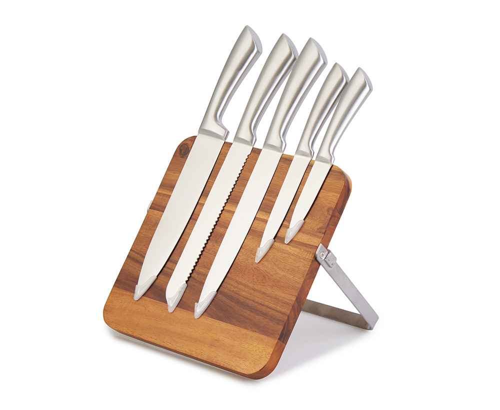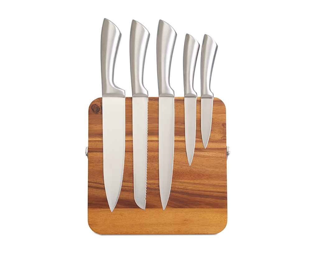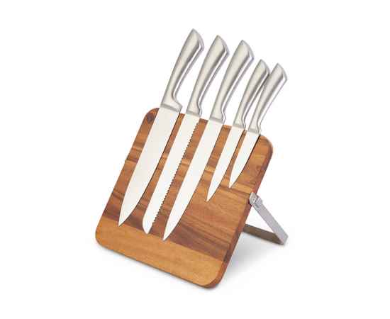 Набор ножей Терон на магнитной подставке из акации — это отличное решение для организации рабочего пространства на кухне. В комплекте пять ножей из нержавеющей стали и подставка, которая объединяет функциональность и природный стиль.
