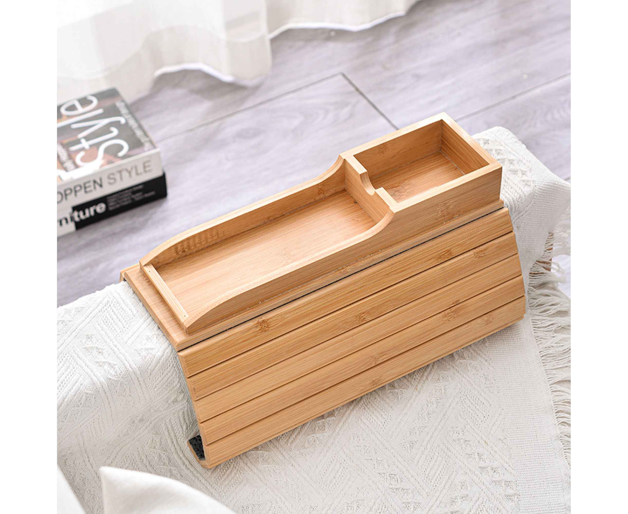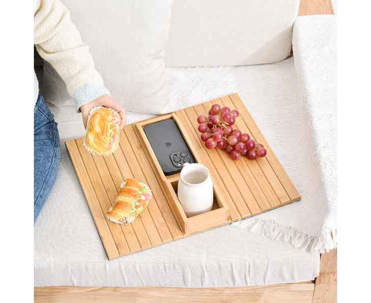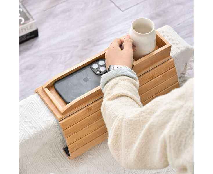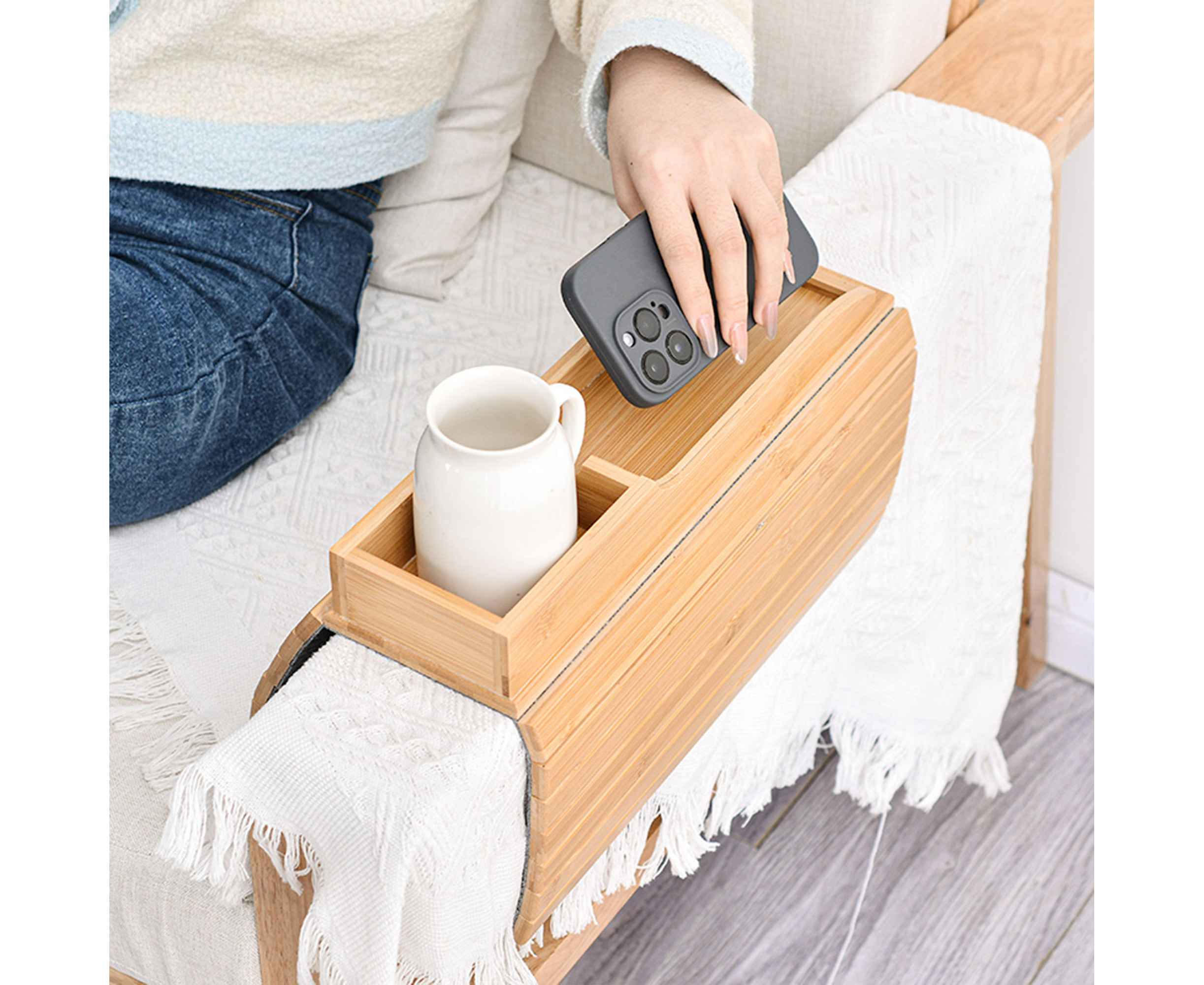 Благодаря реечной конструкции, органайзер можно легко разместить на кресле или диване. Нескользящее основание обеспечивает дополнительную фиксацию на различных поверхностях. Бамбук хорошо смотрится в любом интерьере. "Tray" идеально подходит как для дома, так и для офиса.