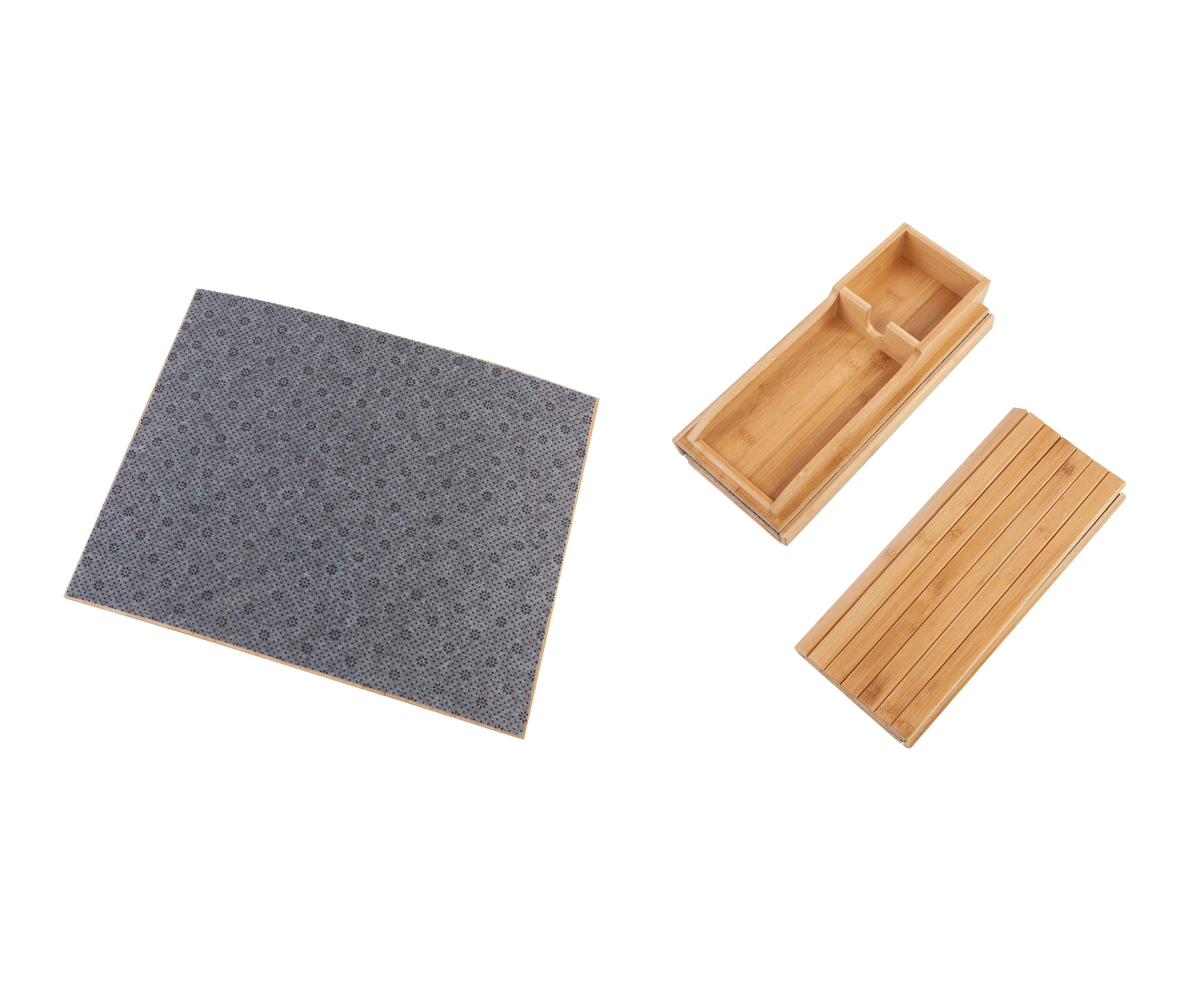 Органайзер защищает поверхность мебели, его можно использовать как подставку под горячее. Складная конструкция позволяет минимализировать объем и удобно хранить аксессуар.