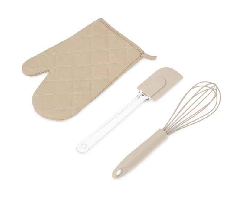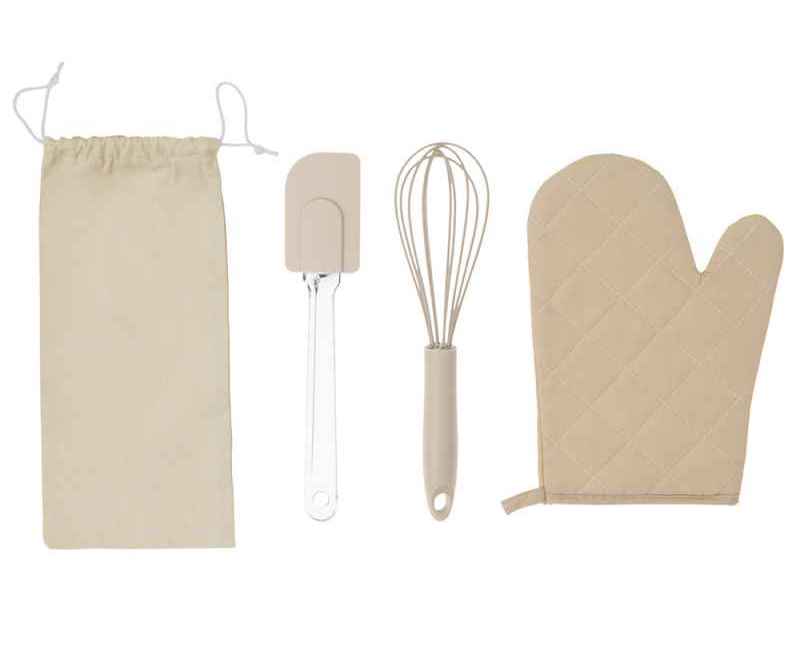 Набор Canele состоит из трёх предметов, без которых не обходится приготовление ни одного пирога или торта: венчика для взбивания яиц или крема, лопатки и прихватки для горячего.