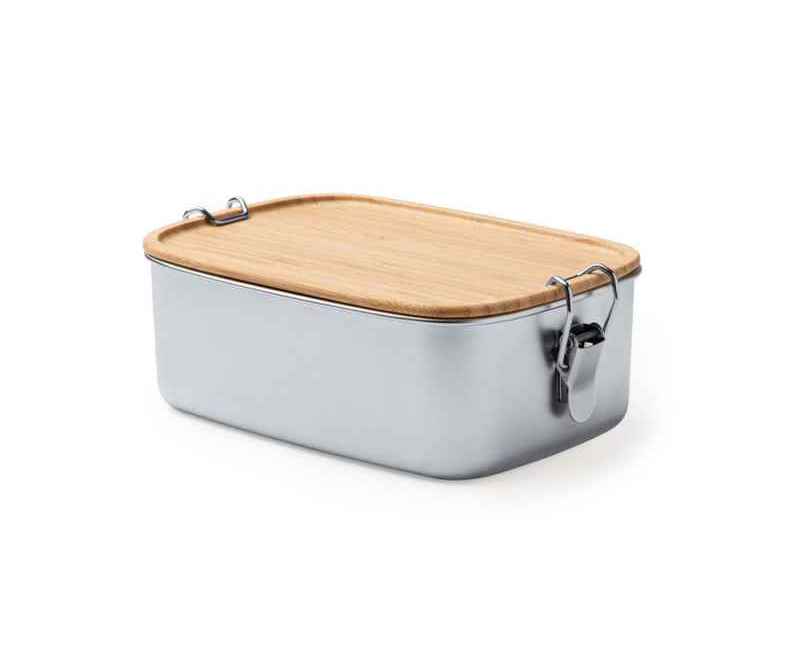 Ланч-бокс из нержавеющей стали 304 с бамбуковой крышкой с системой закрытия с помощью боковых пряжек. Большая емкость 1 л для хранения продуктов.