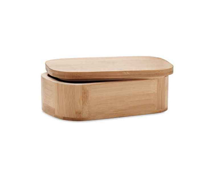 Бамбуковый ланчбокс со съемным разделителем и съемным эластичным ремешком. Только для сухих продуктов. Вместимость: 650 мл.
