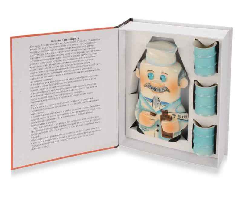 Настольная книга врача — это изящный и оригинальный фарфоровый набор, выполненный в виде книги. В комплект входят штоф и рюмочки, украшенные тематическими изображениями и деталями, связанными с медициной и врачебной практикой. Такой набор станет стильным украшением стола и отличным подарком для медицинских работников, студентов или любителей медицины. Штоф удобно использовать для хранения напитков, а рюмочки — для подачи любимых напитков в торжественной обстановке. Этот набор в виде книги подчеркнет профессиональную тематику и создаст особую атмосферу уюта и уважения к профессии врача.