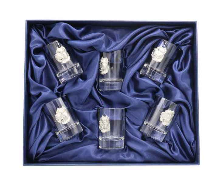 Шесть стопок объемом 50 мл каждая, украшенных литыми оловянными барельефами с изображением «Друг человека». Барельефы выполнены из сплава олова, что обеспечивает их прочность и качество.
