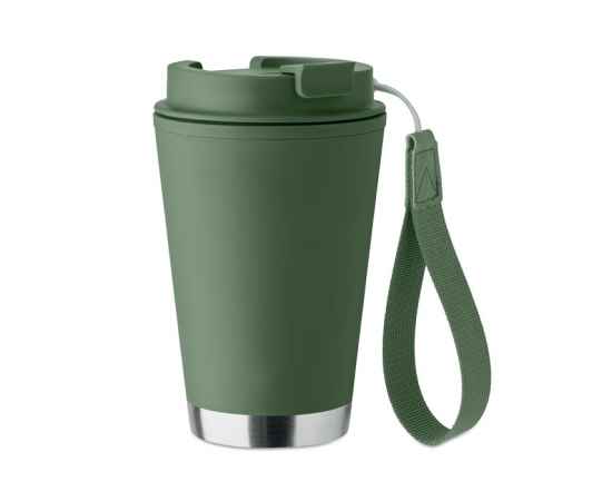 Double wall tumbler in PP inner wall, recycled PP outside wall, recycled stainless steel detail and RPET wrist strap. Capacity: 300 ml.