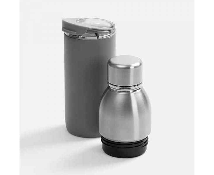 Varianti — это яркий пример посуды с двойной функциональностью. Один и тот же корпус можно превратить как в термостакан для чая и кофе с пластиковой крышкой, так и в термобутылку для прохладительных напитков — с крышкой стальной.