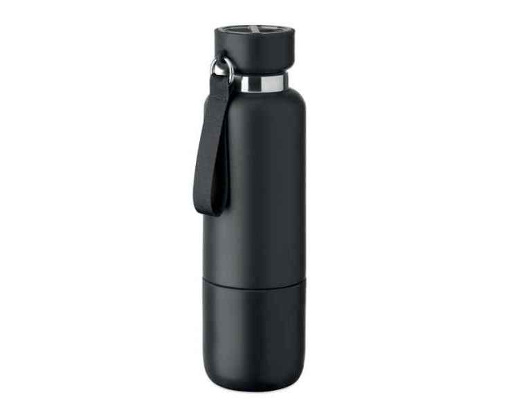 Термобутылка с двойной изоляцией из 90% переработанной нержавеющей стали и 10% нержавеющей стали с ручкой-ремешком и дополнительным длинным ремнем (70 см) в крышке из полипропилена. Герметичная. В комплект входит чашка. Емкость: 500 мл.