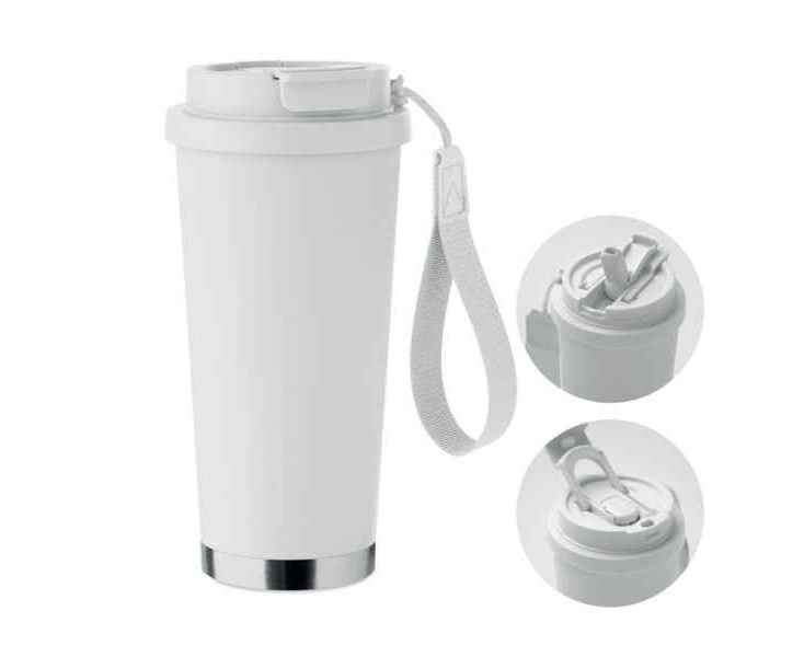 Термокружка с двойными стенками из 90% переработанной нержавеющей стали и 10% нержавеющей стали с пластиковой крышкой, трубочкой для питья и ремнем для переноски. Герметичный. Емкость: 500 мл.
