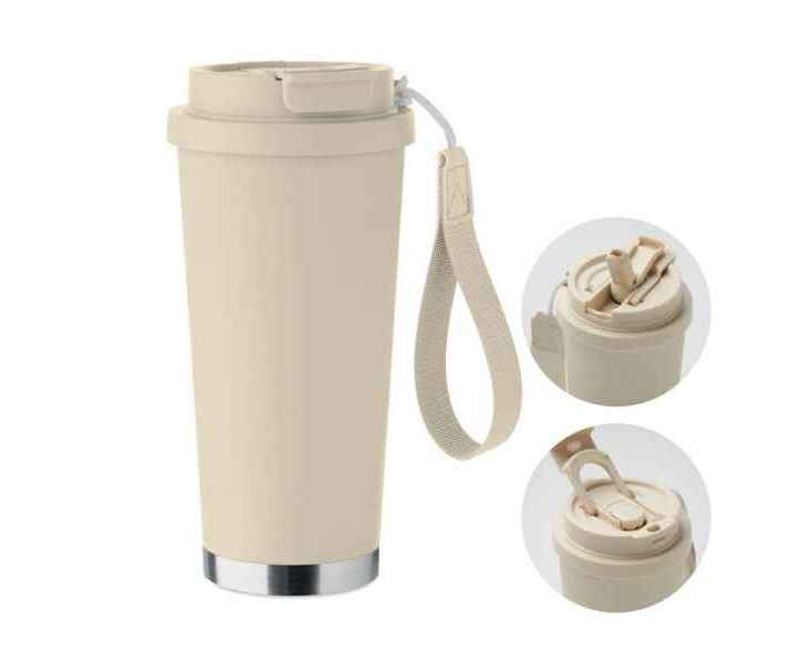 Термокружка с двойными стенками из 90% переработанной нержавеющей стали и 10% нержавеющей стали с пластиковой крышкой, трубочкой для питья и ремнем для переноски. Герметичный. Емкость: 500 мл.