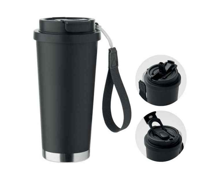 Термокружка с двойными стенками из 90% переработанной нержавеющей стали и 10% нержавеющей стали с пластиковой крышкой, трубочкой для питья и ремнем для переноски. Герметичный. Емкость: 500 мл.
