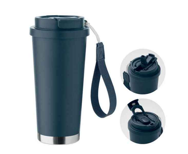 Термокружка с двойными стенками из 90% переработанной нержавеющей стали и 10% нержавеющей стали с пластиковой крышкой, трубочкой для питья и ремнем для переноски. Герметичный. Емкость: 500 мл.