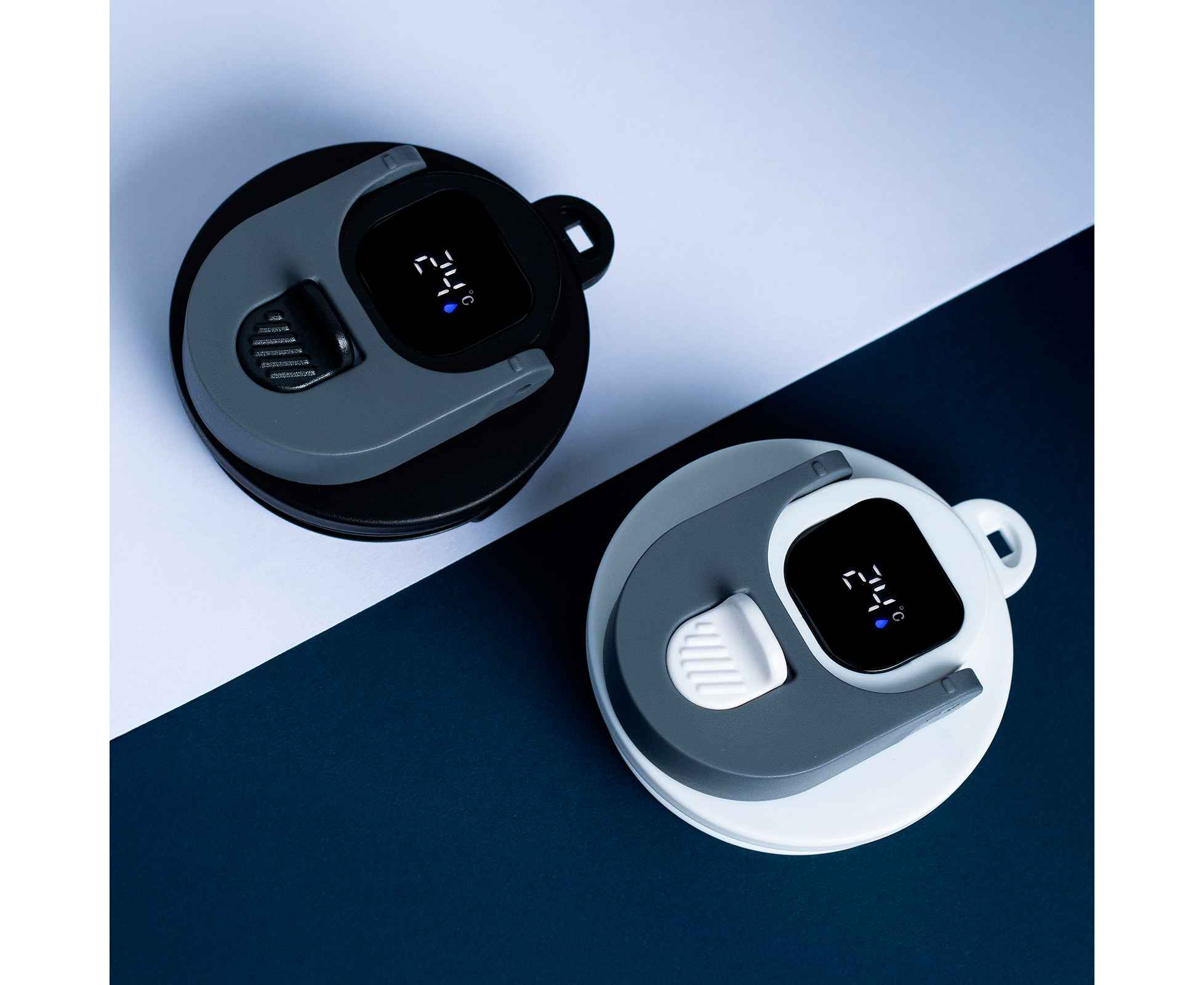 Крышка из пластика с откидным механизмом на кнопке-защёлке. LED-дисплей в крышке — точная температура напитка в реальном времени.