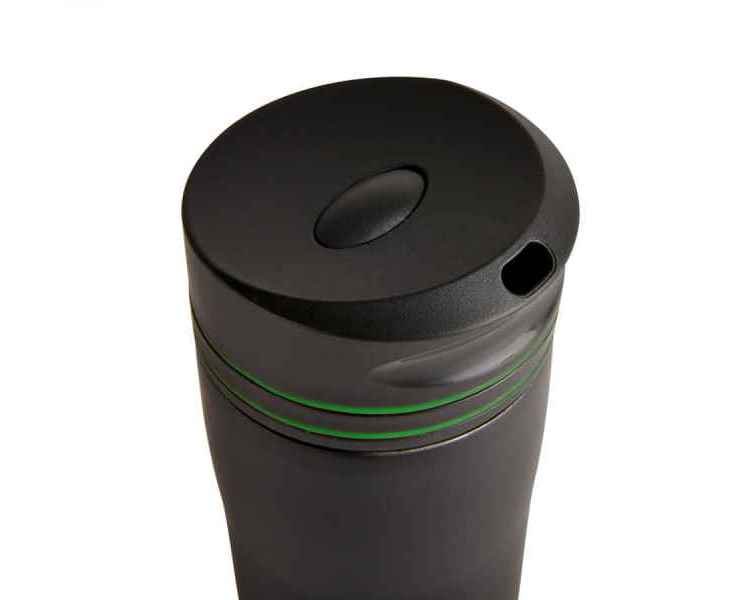 Вакуумная термокружка, емкость 380 мл. Кружка упакована в белую картонную коробку. Яркие силиконовые детали отлично сочетаются с черным цветом. Сдержанное и стильное решение.