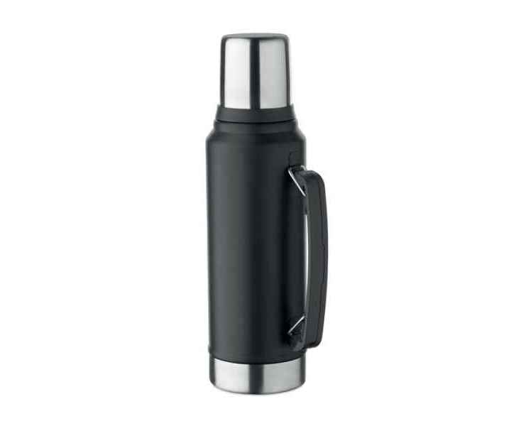 Термос с двойными стенками из переработанной нержавеющей стали 90% и 10% нержавеющей стали с боковой ручкой, крышкой из полипропилена и чашкой из переработанной нержавеющей стали. Герметичный. Емкость: 1 л.