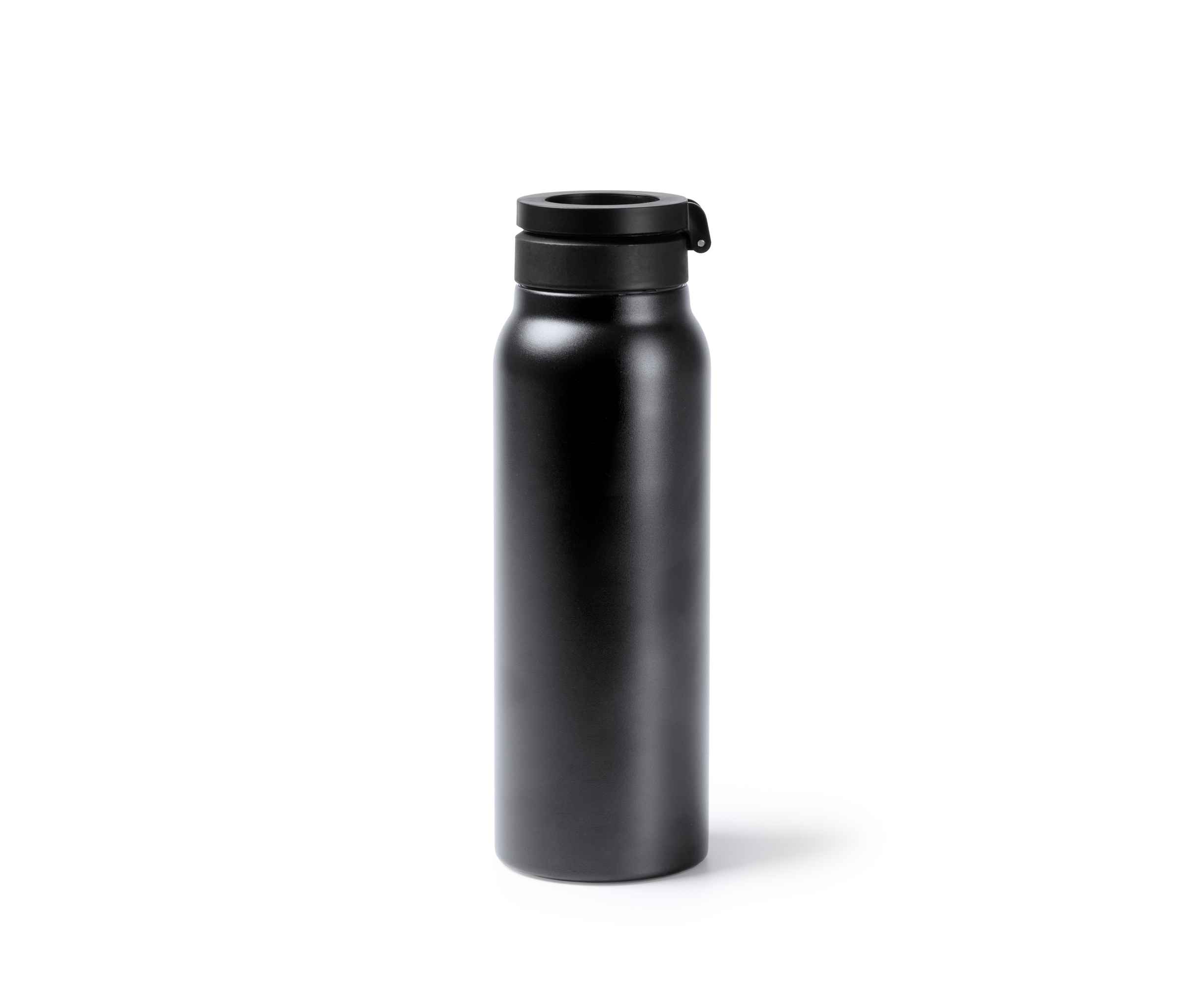Бутылка-термос из переработанной нержавеющей стали с двойными стенками. Крышка с магнитным кольцом для держателя мобильного телефона. Со складной соломкой и нескользящей резиной на основании. Емкость: 750 мл.