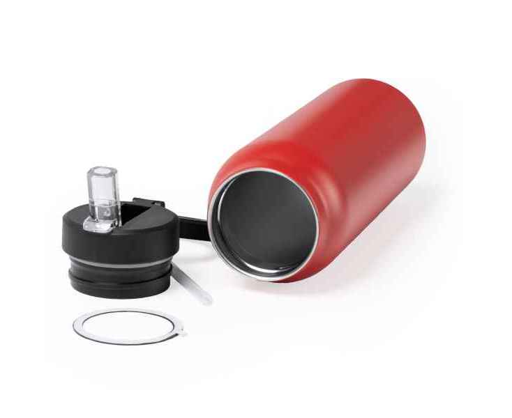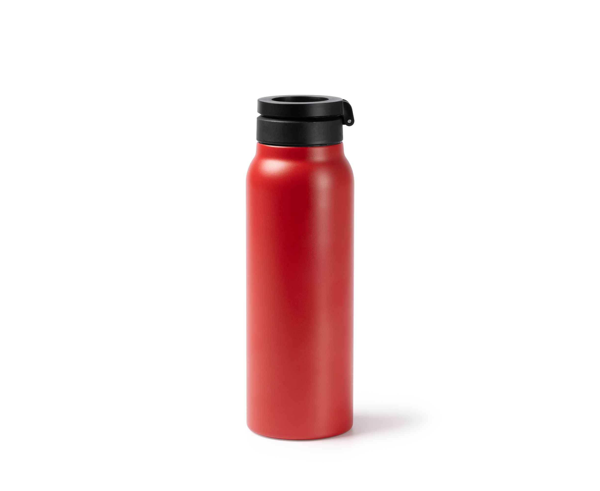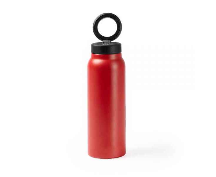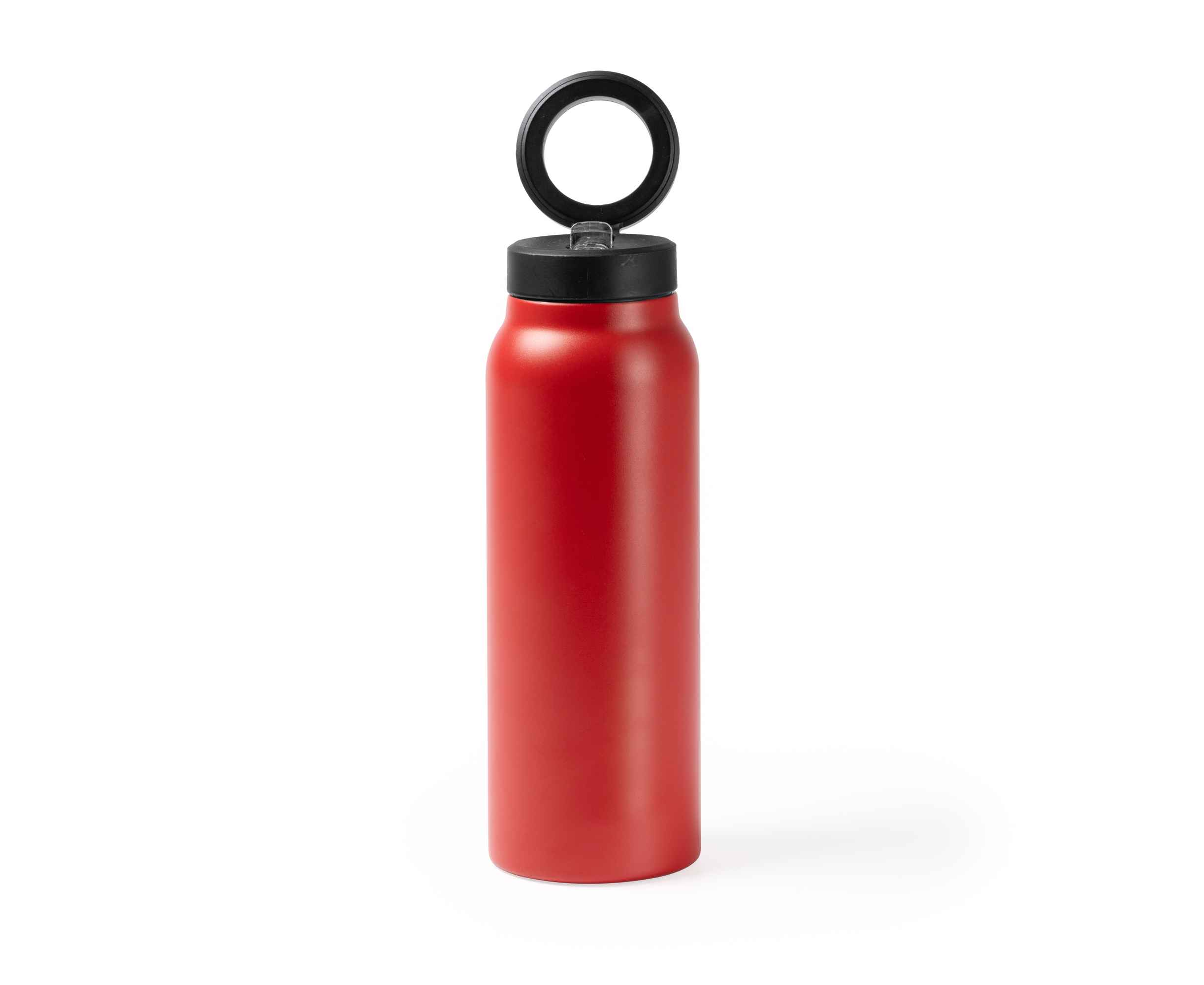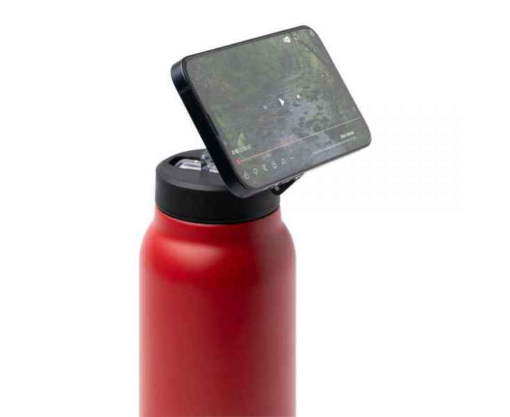 Бутылка-термос из переработанной нержавеющей стали с двойными стенками. Крышка с магнитным кольцом для держателя мобильного телефона. Со складной соломкой и нескользящей резиной на основании. Емкость: 750 мл.