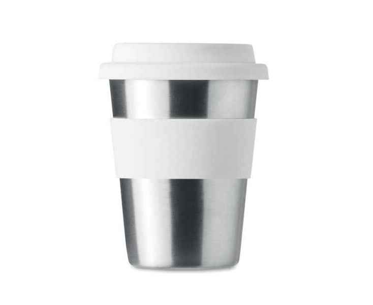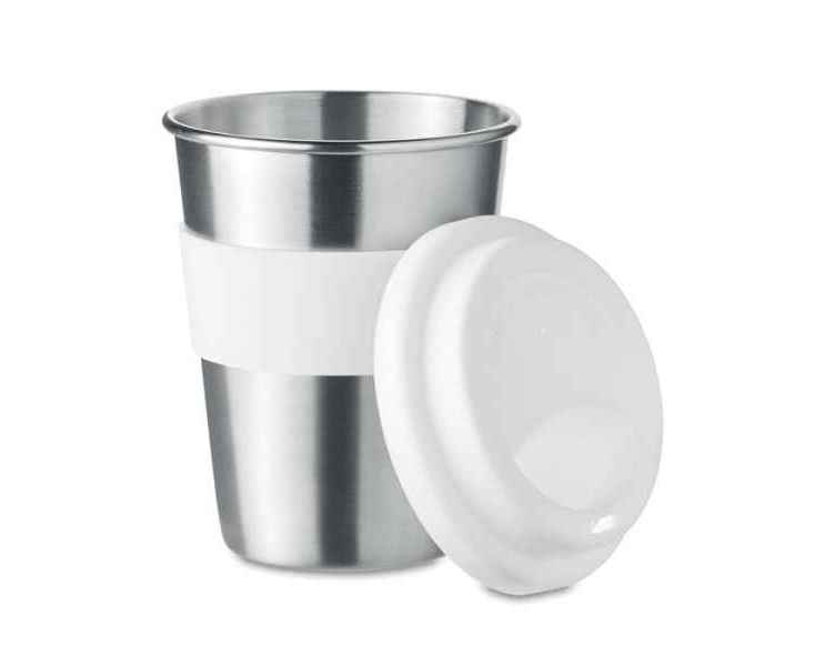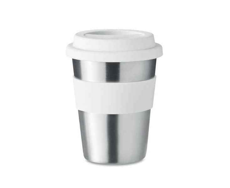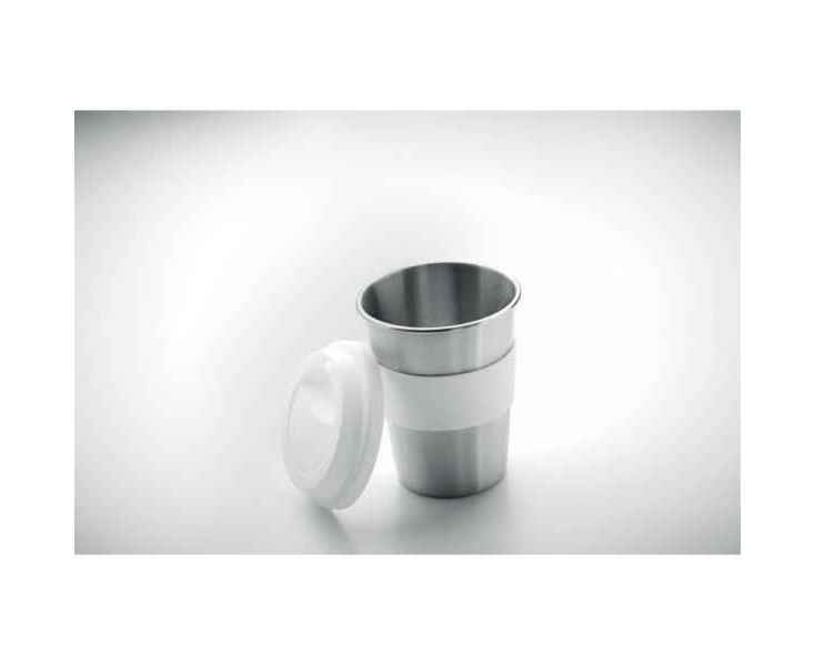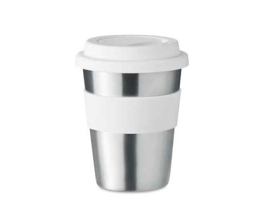Одностенная термокружка из нержавеющей стали с силиконовой крышкой и манжетой. Емкость 350 мл. Возможно нагревание стенок.