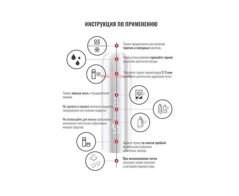 BPA Free. В пластмассах, используемых для производства термосов, отсутствует Бисфенол А – BPA признанный в мире вредным для здоровья человека.
