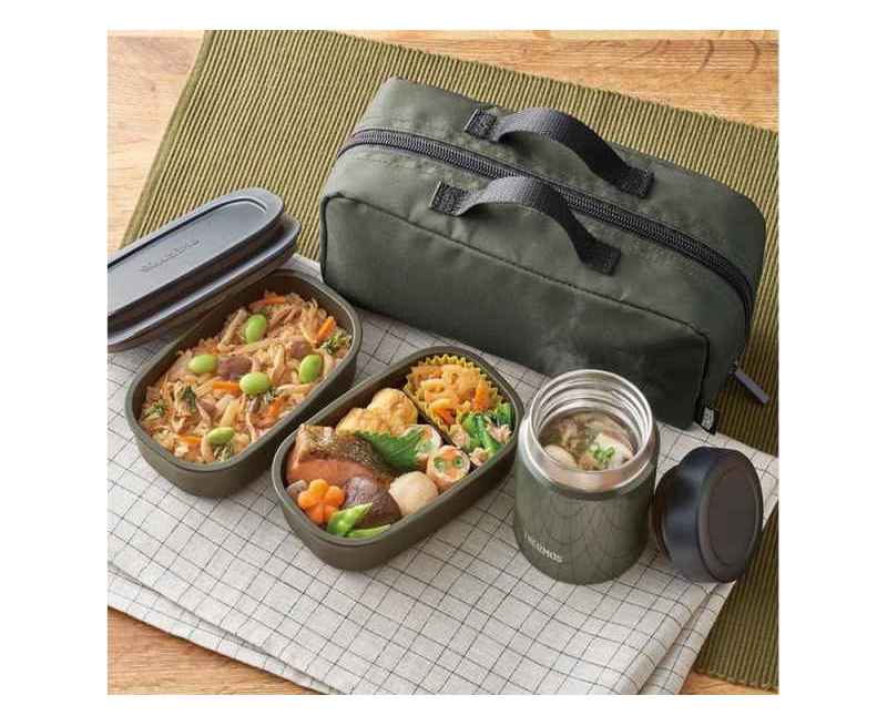 Для удобного хранения и переноски всего набора предусмотрена специальная сумка-термос с двумя текстильными ручками. Сумка на молнии с двумя бегунками, обеспечивающими быстрый доступ внутрь, а многослойная теплоизоляция защищает содержимое от внешних температурных воздействий. Над ланч-боксами ещё остаётся свободное пространство, куда можно поместить бутерброды или приборы с салфетками.