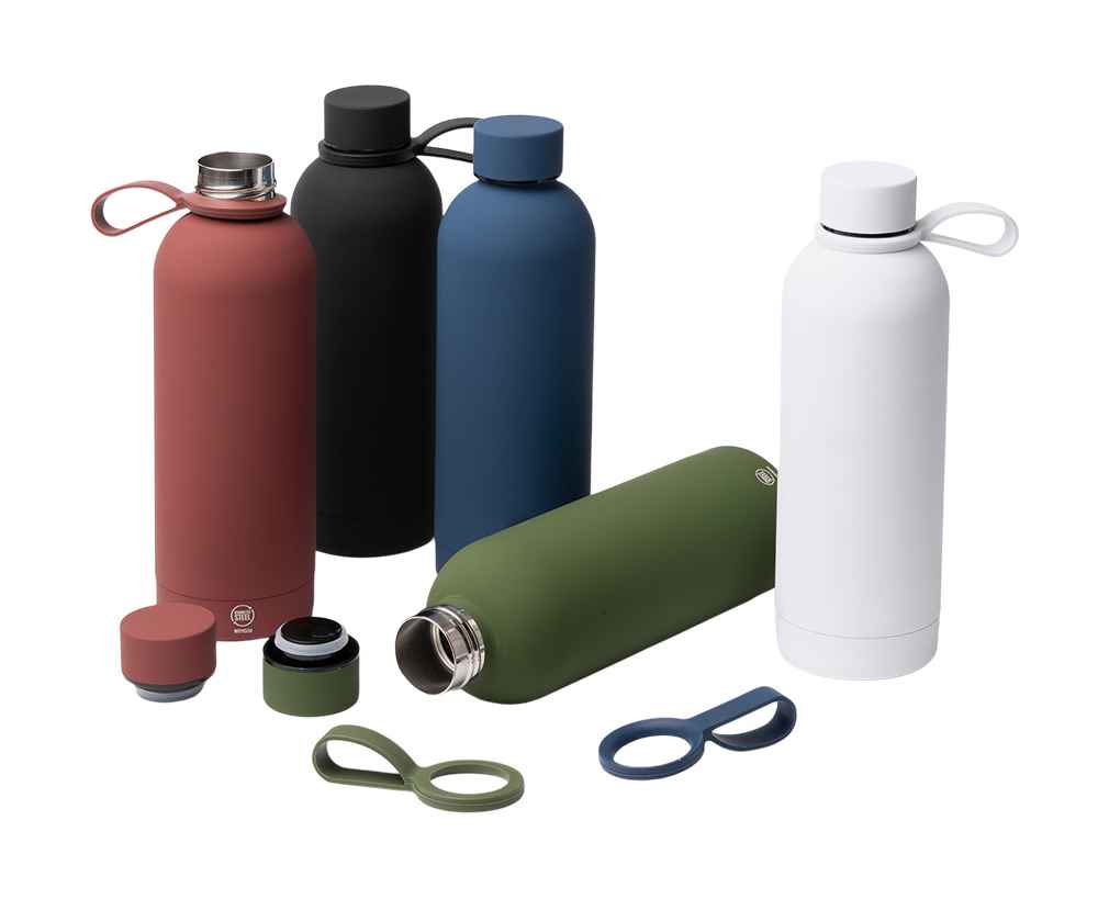 Термобутылка из переработанной нержавеющей стали 304. Мягкая прорезиненная поверхность на корпусе. Удобная силиконовая ручка для переноски. Оснащена противокапельной системой благодаря силиконовому кольцу, встроенному во внутреннюю часть крышки. Крышка и ручка соответствуют цвету корпуса. Объем: 500 мл.