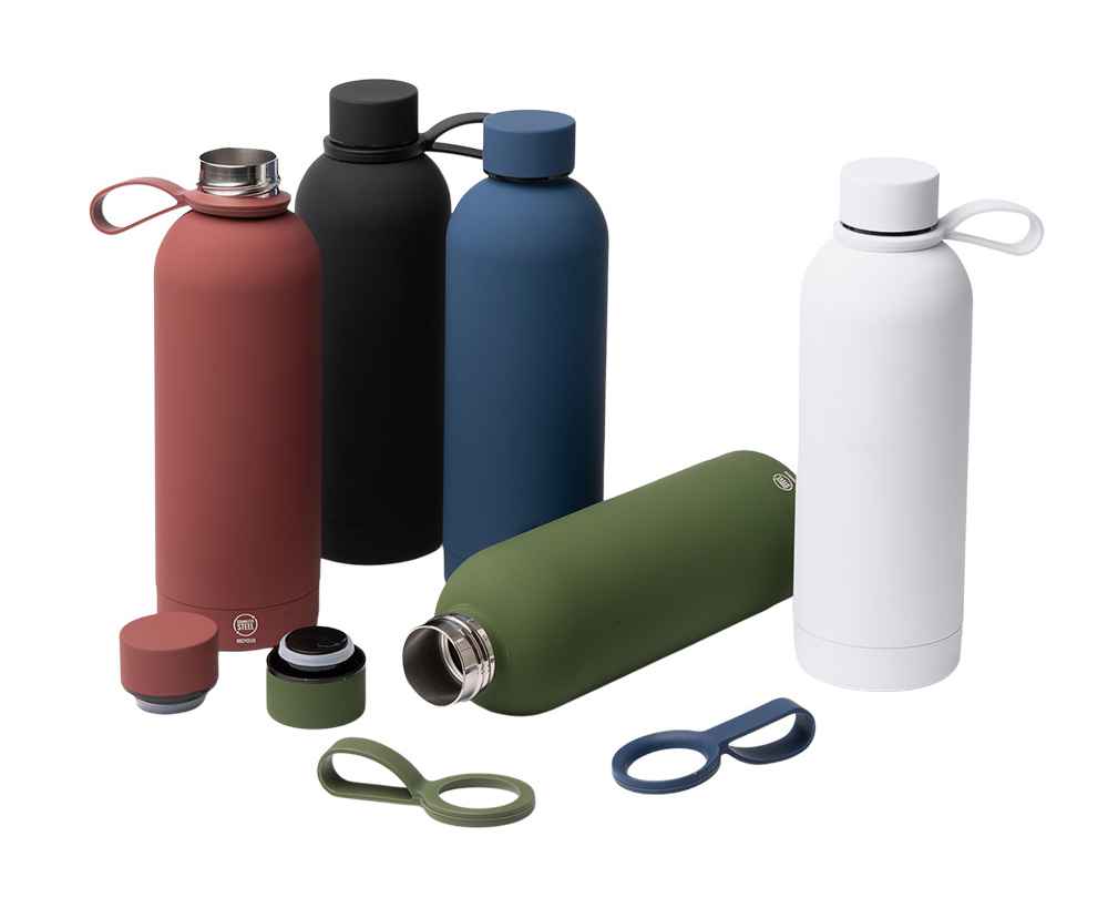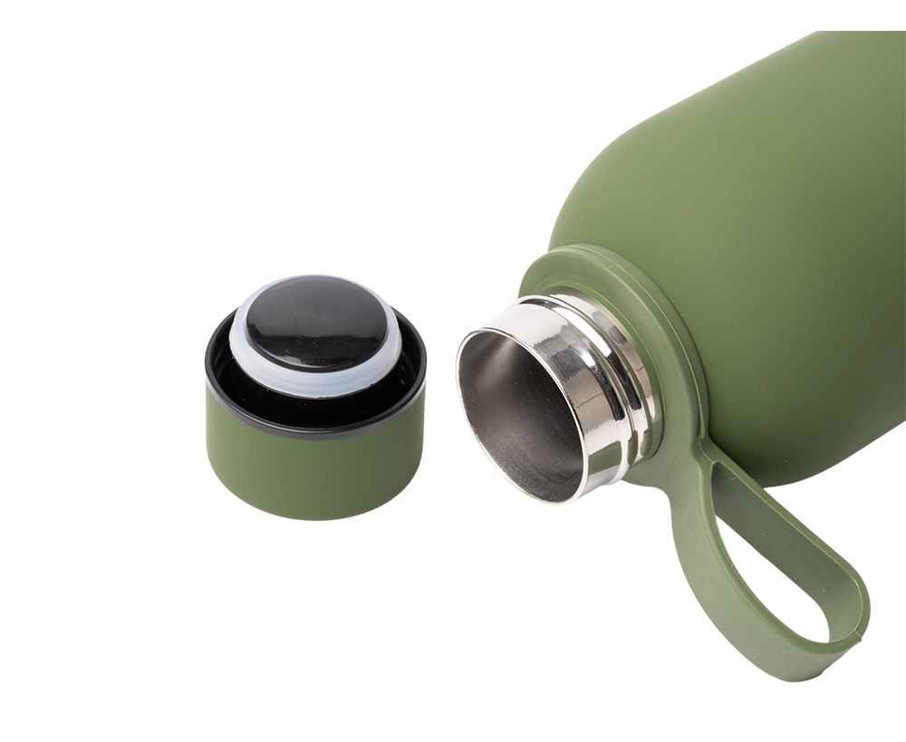 Термобутылка из переработанной нержавеющей стали 304. Мягкая прорезиненная поверхность на корпусе. Удобная силиконовая ручка для переноски. Оснащена противокапельной системой благодаря силиконовому кольцу, встроенному во внутреннюю часть крышки. Крышка и ручка соответствуют цвету корпуса. Объем: 500 мл.