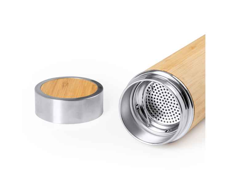 Термос из нержавеющей стали с двойными стенками, завинчивающейся крышкой и съемным внутренним фильтром. Внешняя стенка из натурального бамбука. Емкость 500 мл.