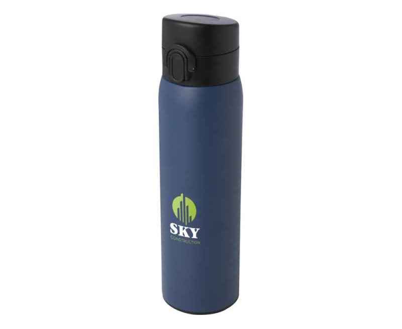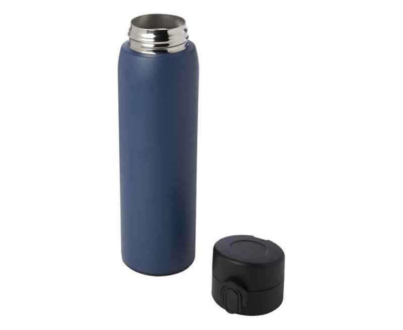 Стильная фляга-термос из переработанной нержавеющей стали, сертифицированная RCS, с простым механизмом открытия с помощью кнопки. Фляга герметична, а благодаря медной вакуумной изоляции напитки будут сохраняться горячими или холодными в течение нескольких часов. Объем составляет 450 мл. Поставляется в подарочной коробке из переработанного картона. Recycled stainless steel, Recycled PP Plastic. Packaging: FSC Mix Credit P5.1 CU-COC-877277.