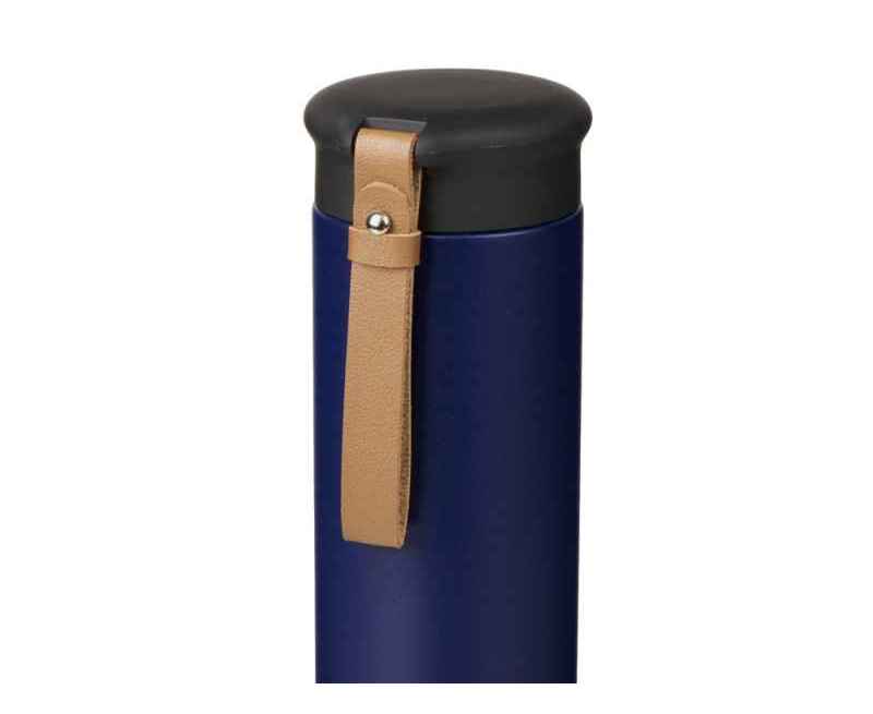 Термос герметично завинчивается на крышку, оснащенную съемным ремешком из качественной ПУ кожи. Крышка имеет прорезиненное покрытие, что создает интересное сочетание текстур в рамках одной модели. Корпус имеет элегантную рельефную поверхность с антискользящим эффектом.