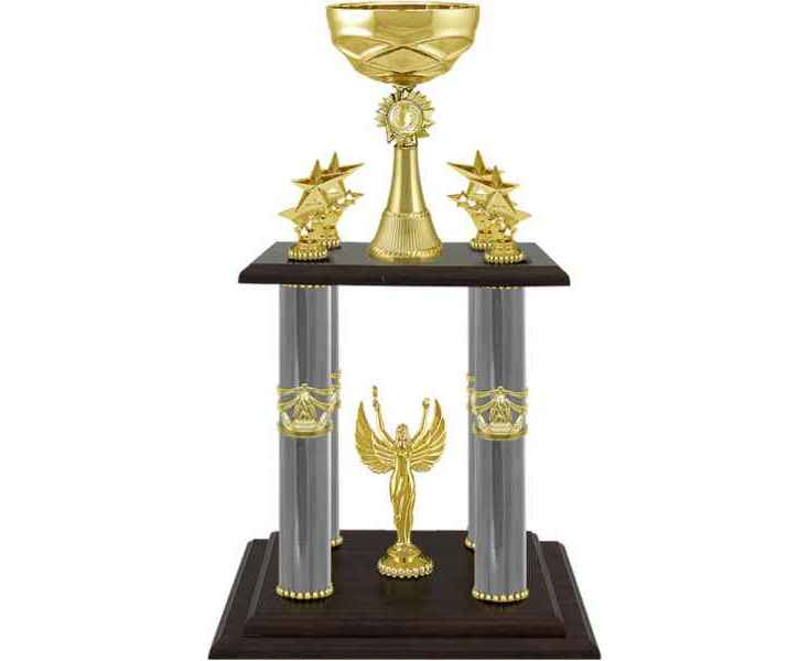 Кубок оригинальной формы с нестандартными дополнениями и подставкой в виде подиума. Размер пластиковых фигур: звезды 7 см, Ника 14 см.