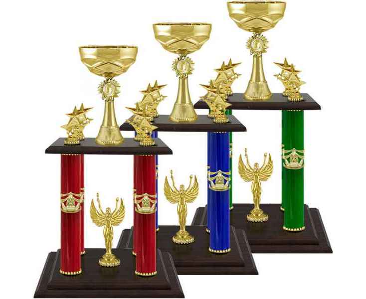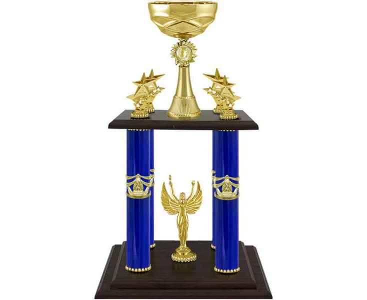 Кубок оригинальной формы с нестандартными дополнениями и подставкой в виде подиума. Размер пластиковых фигур: звезды 7 см, Ника 14 см.