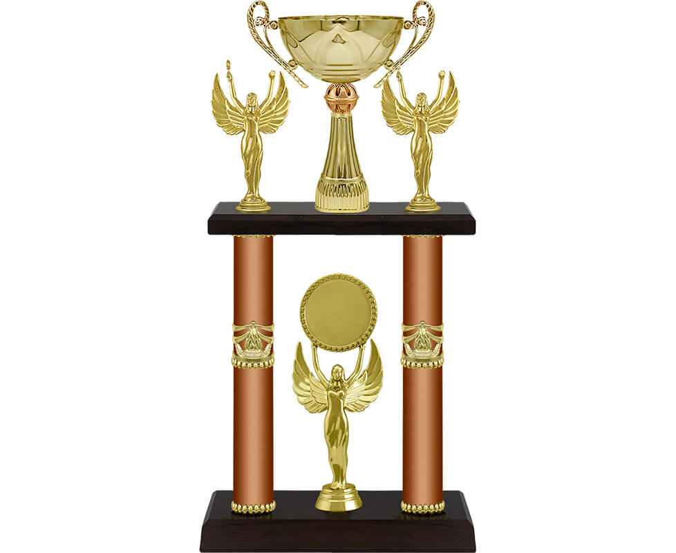 Кубок оригинальной формы с нестандартными дополнениями и подставкой в виде подиума. Средняя часть состоит из металлических труб диаметром 30 мм. Размеры фигур: Ники 11 см (2 шт), Ника 17,5 см.
