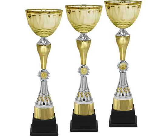 Кубок, серия кубков традиционной формы с элегантными чашами из металла и изысканными стемами из пластика. Металлическая эмблема 25 мм в комплекте.
