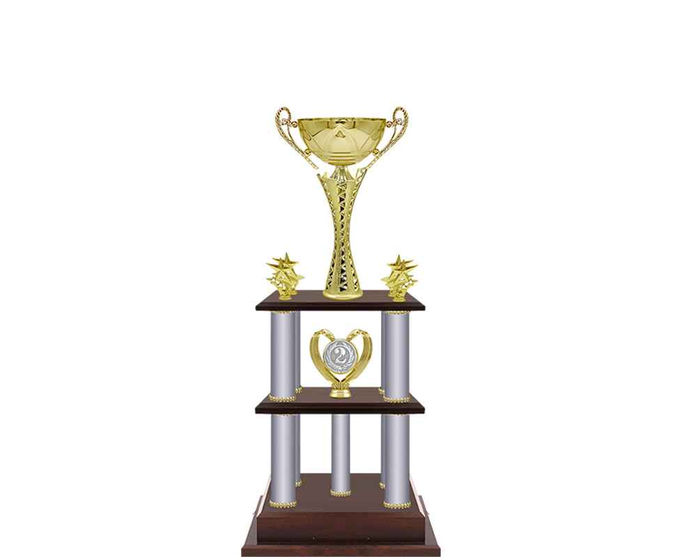 Кубок оригинальной формы с нестандартными дополнениями и подставкой в виде подиума.