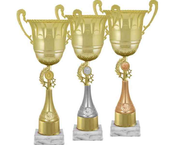 Серия кубков традиционной формы с элегантными двойными чашами из металла и изысканными стемами из пластика. Металлическая эмблема 25 мм в комплекте.