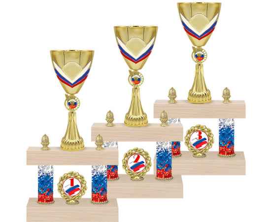 Кубок оригинальной формы с нестандартными дополнениями и подставками в виде подиума из натурального дерева. Металлическая эмблема 50 мм в комплекте. Скидка по дисконтной карте ограничена!