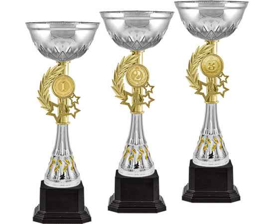 Кубок, серия кубков традиционной формы с элегантными чашами из металла и изысканными стемами из пластика. Металлическая эмблема 25 мм в комплекте.