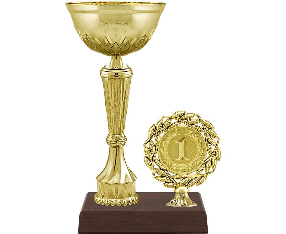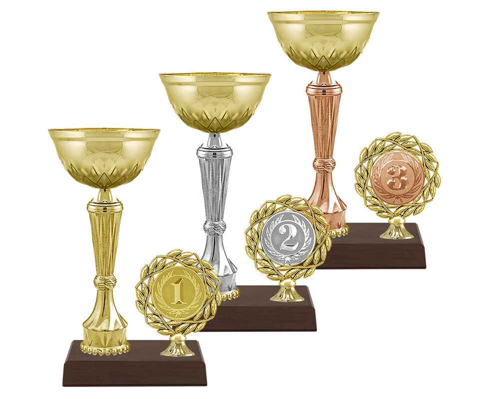 Кубок, серия кубков традиционной формы с элегантными чашами из металла и изысканными стемами из пластика. Металлическая эмблема 50 мм в комплекте.