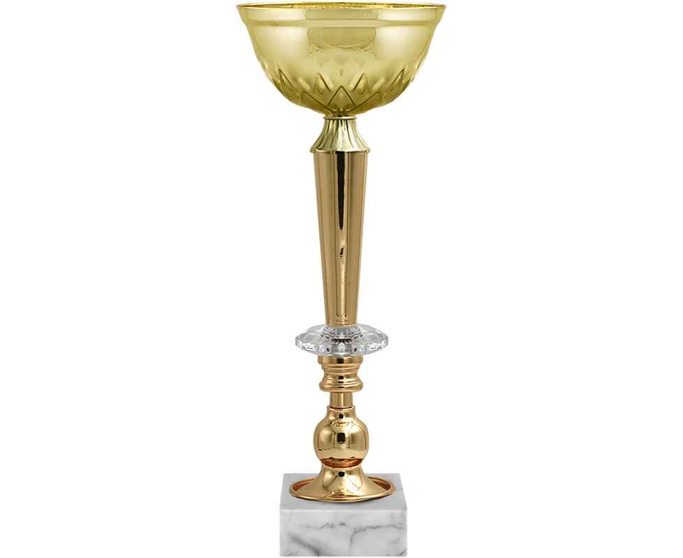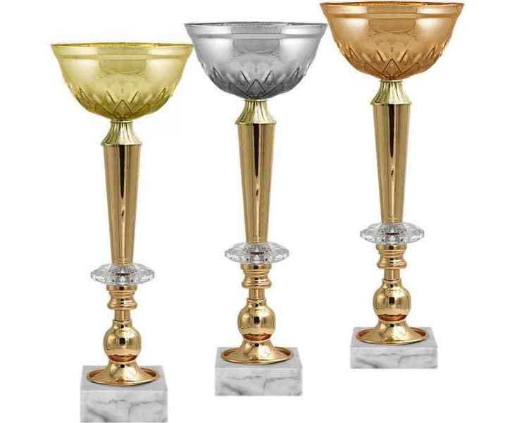 Элегантные наградные кубки, сочетающие классические элементы с роскошными и прозрачными деталями (средняя часть - клин и ножка из металла).