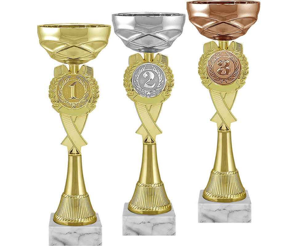Серия кубков традиционной формы с элегантными чашами из металла и изысканными стемами из пластика. Металлическая эмблема 50 мм в комплекте.