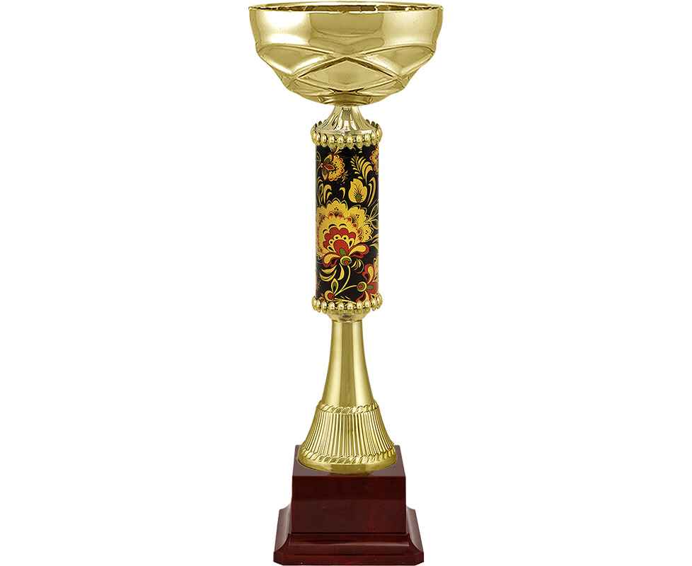 Серия традиционной формы с элегантными чашами из металла и изысканными ножками из пластика. Средняя часть кубка представляет собой пластиковую трубу с наклейкой с росписью под хохлому.