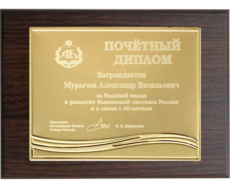 В комплект № 969 входит: ламинированная плакетка из МДФ, металлический диплом с лазерной гравировкой по Вашему макету (разработка макета оплачивается отдельно). ВНИМАНИЕ! Скидка ограничена.