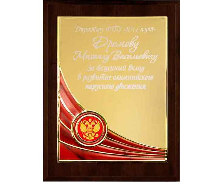 Готовое решение для награждения или подарка. Стандартная плакетка из прессованного дерева, декорированная металлическим дипломом и акриловой эмблемой - Герб России. Лазерная гравировка в комплекте.