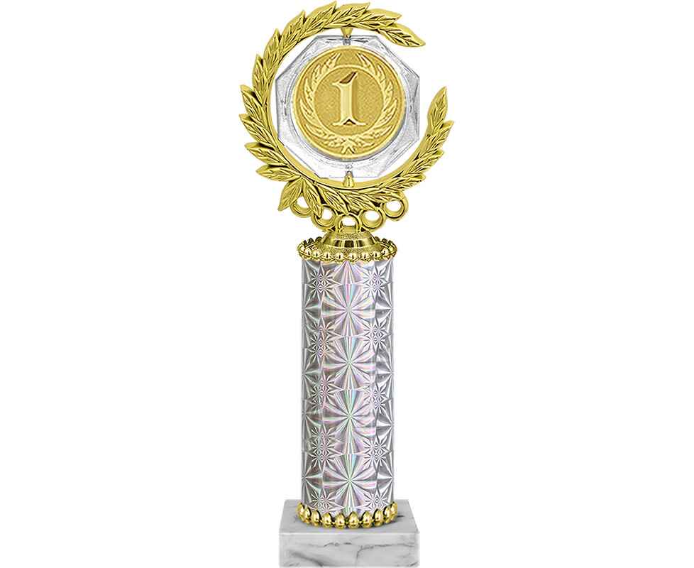 Наградная продукция, идеально подходящая для спортивных или корпоративных мероприятий. Средняя часть награды состоит из пластиковой трубы D 40 мм. Металлическая эмблема 50 мм в комплекте.