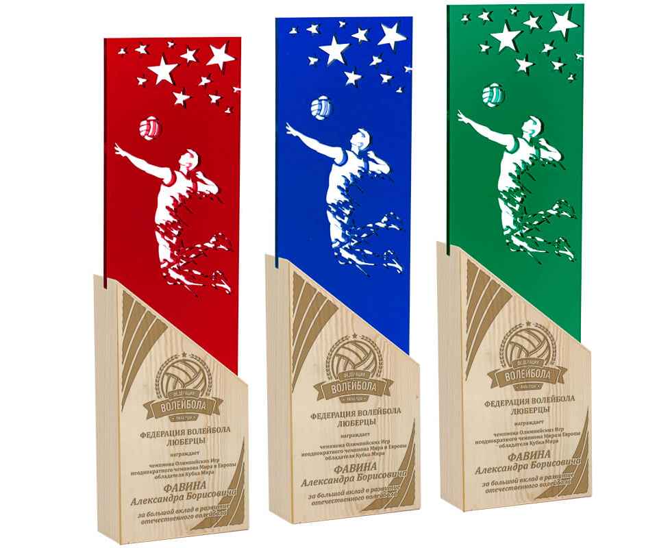 Награда из акрилового цветного стекла на деревянной подставке. Лазерная гравировка на деревянном бруске по Вашему макету! Разработка макета оплачивается дополнительно. Скидка ограничена!