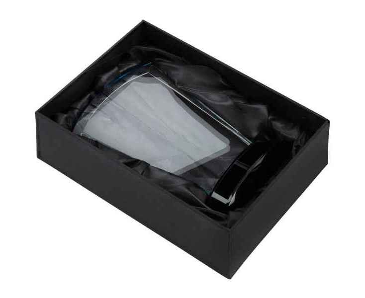 Стела изготовлена из стекла К9, в основе которого лежит оптическое боросиликатное стекло. Эту марку стекла отличает низкий процент посторонних включений, высокий показатель преломления и высокая прозрачность — идеальные качества для изготовления наград премиального уровня.