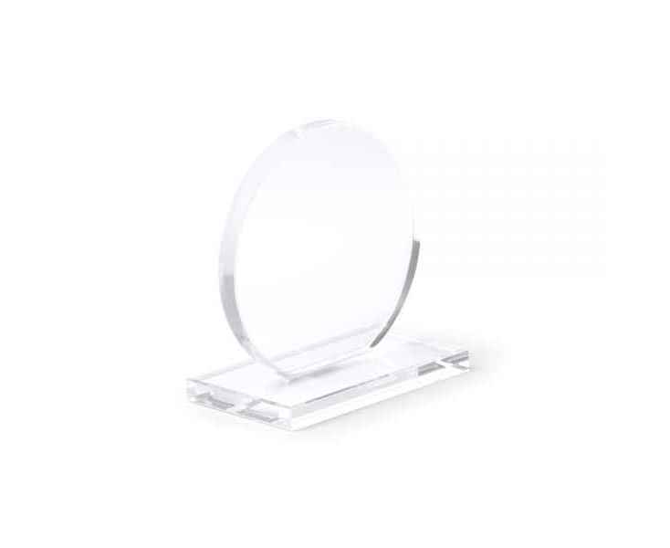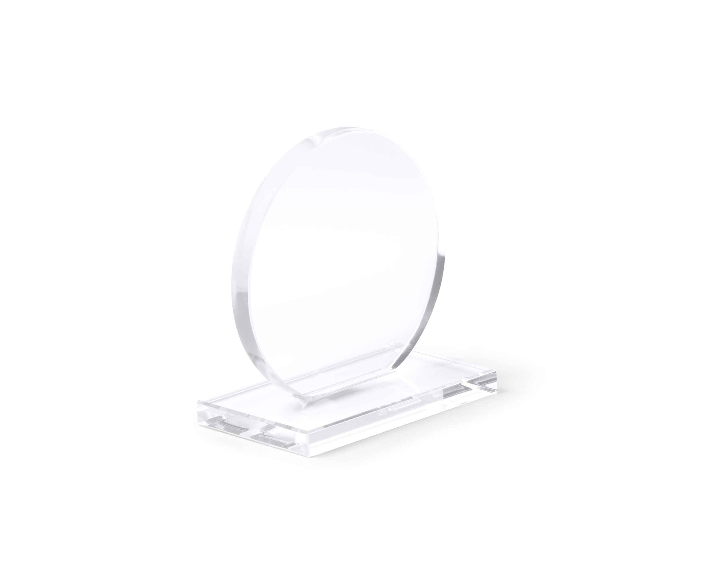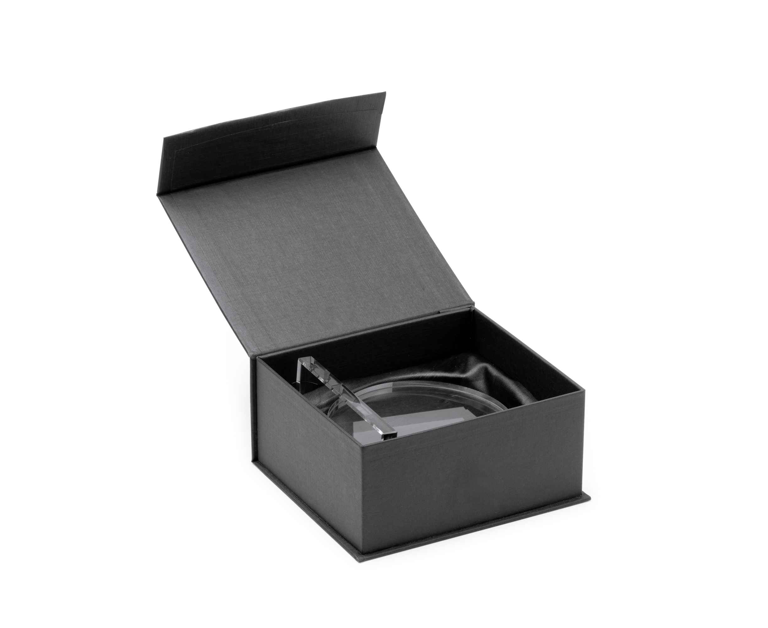 Стеклянная награда круглой формы с прямоугольным основанием. Включает черный презентационный футляр.